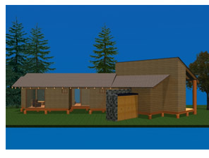 La estructura de muros es de tabiquería de pino revestida exteriormente con siding de fibrocemento imitando madera nativa tanto en su textura como en su color e interiormente con madera de pino tinglado. Piso y cielo interior de madera con vigas de Roble a la vista. Todas las ventanas y puerta principal de Raulí con quincallería embutida de cierre hermético. Cubierta de tejuela asfáltica clasic gris oscura.